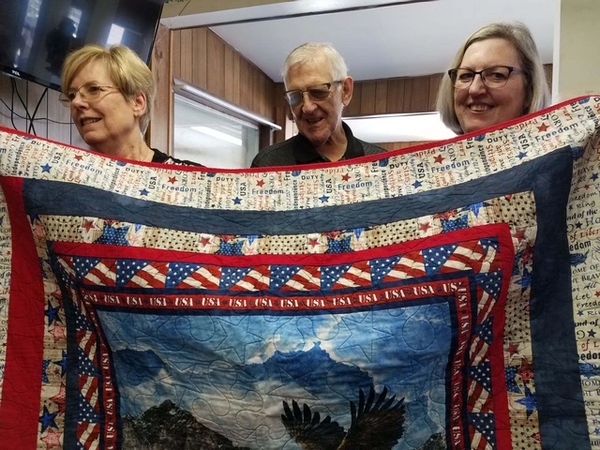 After seeing the panel quilt made by Sheryle for her husband our brother told her he wanted one. Here is the completed quilt with our brother, Chuck.