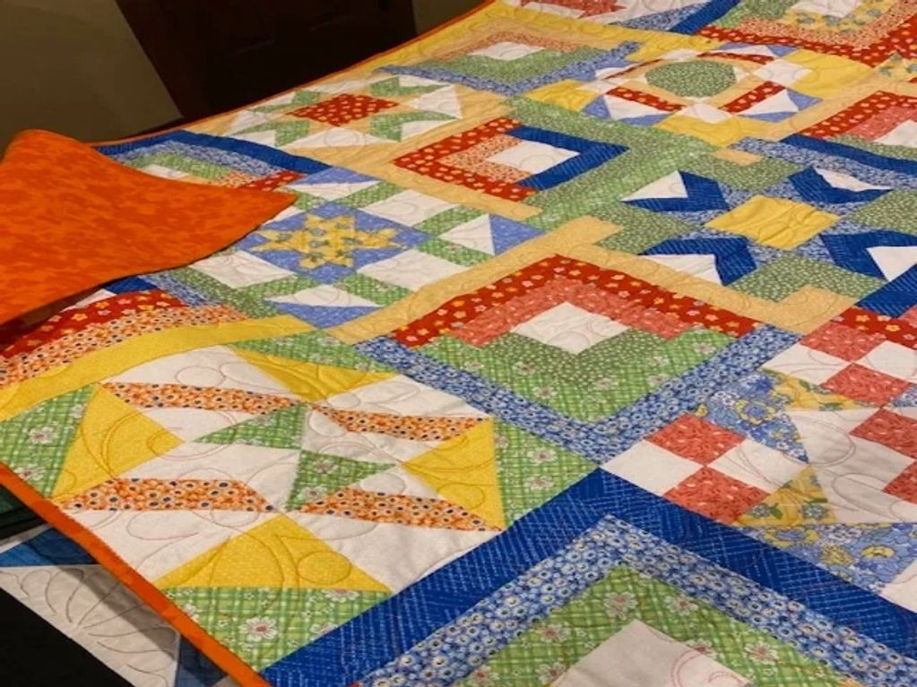 A cute planet and stars panel quilt for Sheryle's grand son-in-law. She liked the vibrant colors in the panels. Purple is one of his favorite colors so she used that color to add a border and the backing. He love it! It was just a simple pattern but turned out super cute!